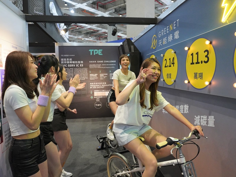 ▲天能綠電於Energy Taiwan展覽中,透過騎腳踏車發電方式,說明售電平台理念,雲豹能源總經理趙書閔(右)親自示範踩腳踏車發電遊戲。