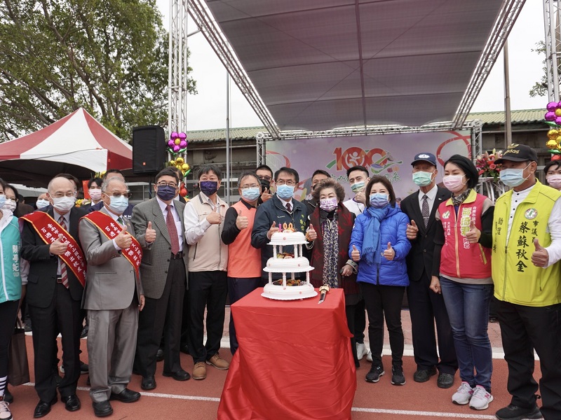 ▲發言人張建偉(右5)與台南市長黃偉哲(左6)等文山校友,以及全校26位師生們一同共襄盛舉,祝福文山國小一百周年生日快樂。