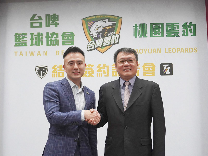 ▲雲豹能源發言人暨桃園雲豹執行長張建偉(右)與台灣啤酒籃球協會理事長林士傑(左)簽下結盟簽約書。