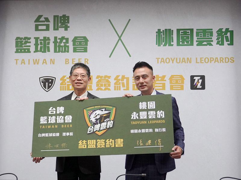 ▲桃園雲豹職籃隊與台啤籃球協會結盟,新球季將以「台啤雲豹職籃隊」之名參與賽事,以強強聯手之姿打造全新風貌。雲豹能源發言人暨桃園雲豹執行長張建偉(左)與台灣菸酒公司董事長丁彥哲(右)合照。