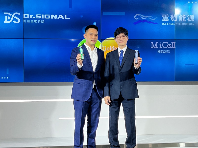 ▲雲豹能源副總譚宇軒(左)與博訊生技創辦人暨董事長秘心吾(右)於2023年亞洲生技展中,宣布攜手合作能源x生技雙重融合計畫。