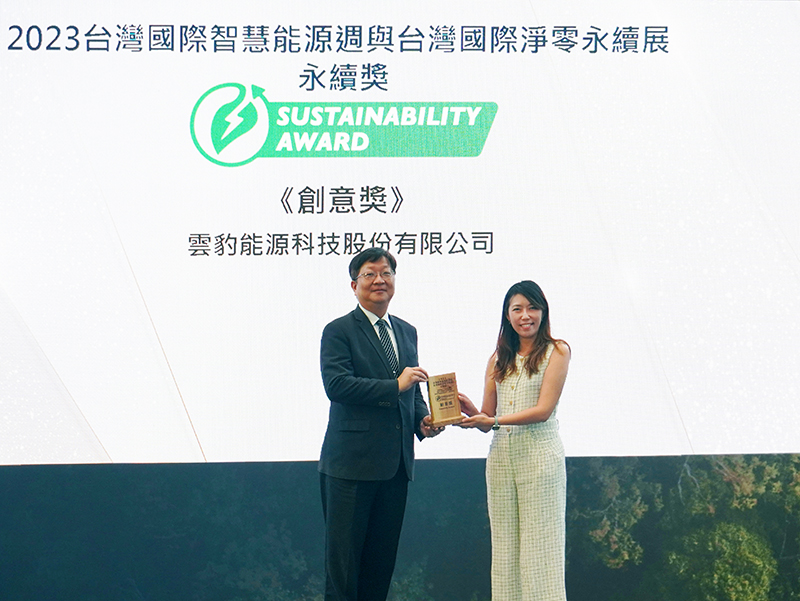 ▲雲豹能源(6869)以「漁電共生・來趣漁村摸蛤仔」創意十足之攤位主題,榮獲「台灣國際智慧能源週」永續創意獎殊榮。經濟部能源署署長游振偉(左)頒發獎座予雲豹能源總經理趙書閔(右)。