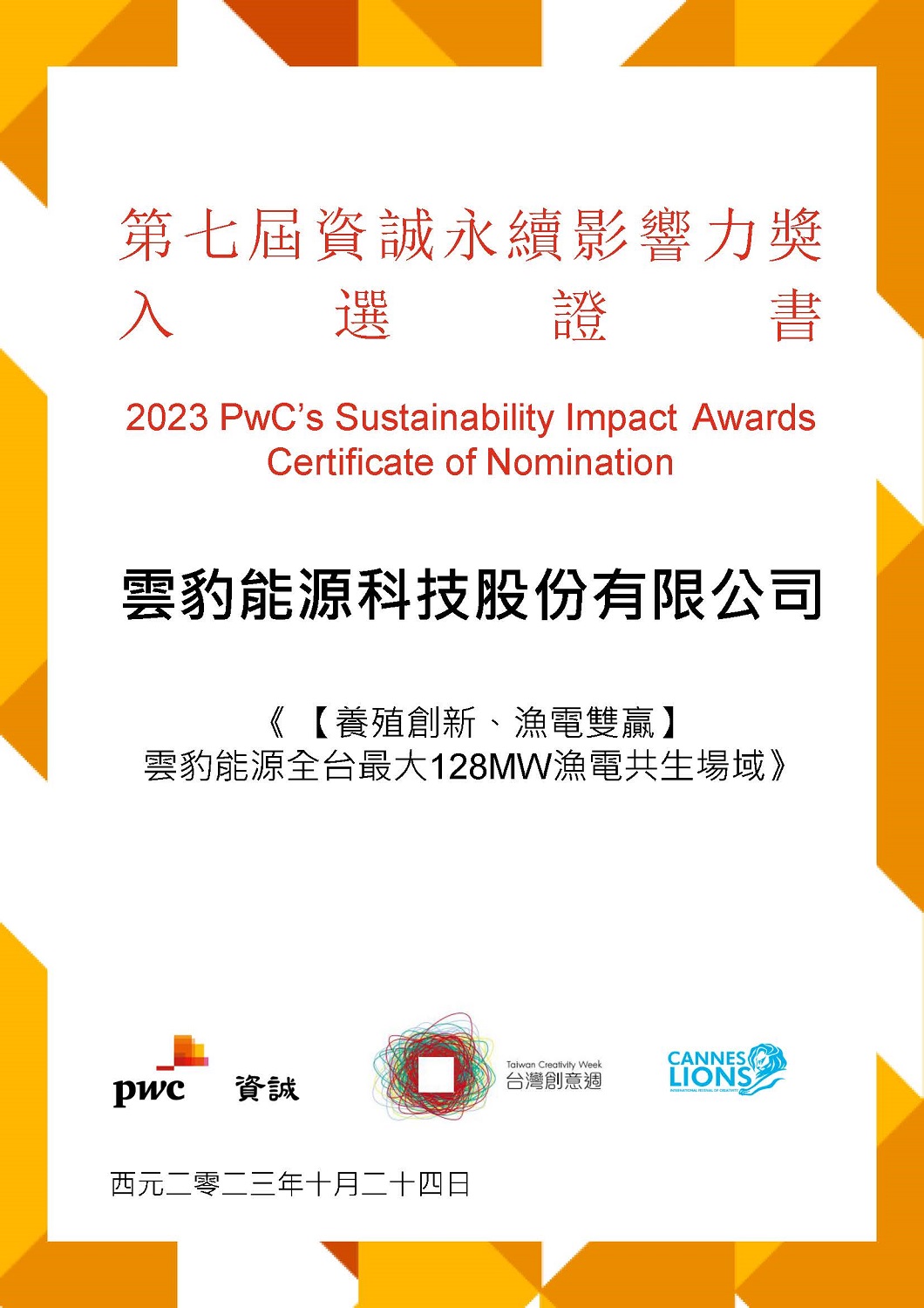 本公司入選資誠永續影響力獎紀錄片「養殖創新、漁電雙贏—雲豹能源全台最大128MW漁電共生場域」,以影像畫面述說經營團隊自2018年起,與70多戶地主、養殖戶及上百位里民深度溝通,共歷時5年多,將170公頃魚塭區重新整合,成功打造全台最大漁電共生指標性案場,全場域每年將可達近500公噸的漁獲收成價值,也為傳統養殖業開創全新契機,以創新模式結合發電、售電與儲能一站式綠電服務,建構完整的綠能生態體系,為台灣永續發揮影響力。