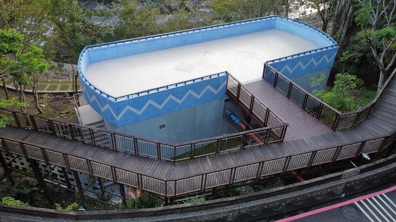▲義盛水資源回收中心以天空藍搭配在地元素施作,並新設木棧道連接小烏來天空步道,每日污水可處理量為170噸,將成為最佳觀光景點。