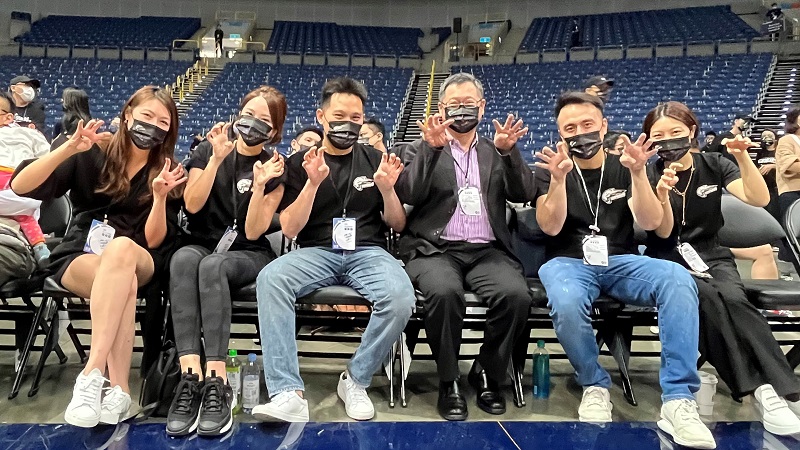 ▲雲豹能源經營團隊齊聚高雄巨蛋,為桃園雲豹首場熱身賽加油打氣。雲豹能源董事長賴勁麟(中)、雲豹能源總經理趙書閔(左一)、雲豹能源副總經理譚宇軒(左三)、雲豹能源發言人張建偉(右二)。
