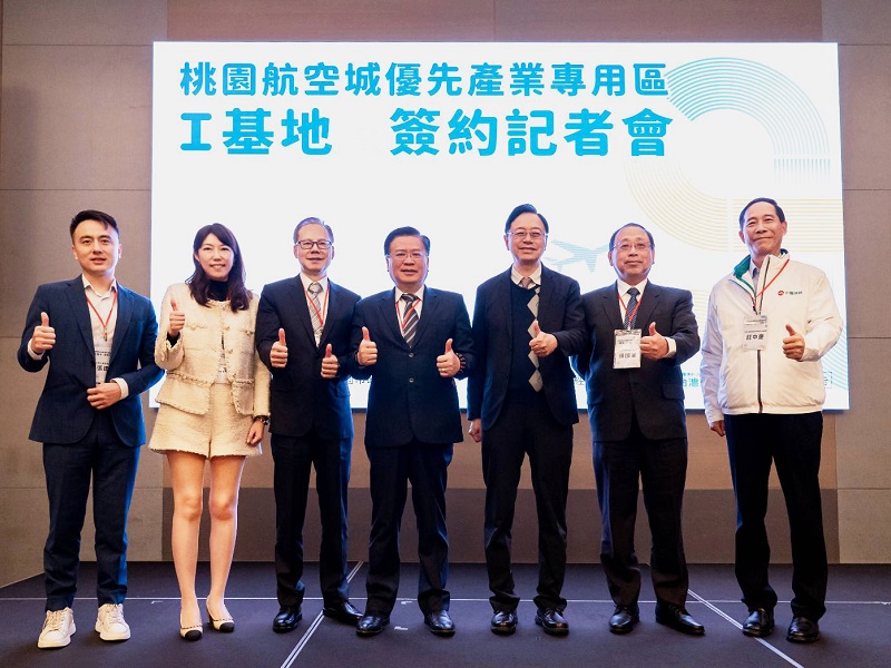 ▲今(24)日桃園市政府舉辦「桃園航空城優先產業專用區I基地簽約記者會」,由雲豹能源總經理趙書閔(左2)、副總經理譚宇軒,以及永續長暨發言人張建偉(左1)以合作夥伴身份出席,與桃園市長張善政(右3)及台灣人壽董事長許舒博(中)等貴賓共同見證航空城計畫重要里程碑。
