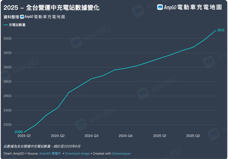 台灣電動車充電基礎設施市場競爭激烈,根據AmpGO充電地圖報告,截至今年第2季,台灣充電營運商已來到51家,與去年同期相比新增14家。全台共有3,512座營運中的充電站,充電樁數量突破1萬1,000座,年成長率為40%,電動車數量與公共充電樁數量的比例為9.1 : 1。