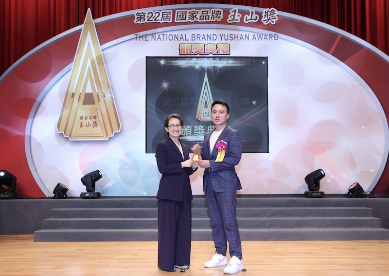 ▲ 雲豹能源榮獲第22屆「國家品牌玉山獎 - 傑出企業獎、傑出企業領導人獎」雙項殊榮,頒獎典禮由副總統蕭美琴擔任頒獎人(左),雲豹能源永續長暨發言人張建偉(右)代表領獎。